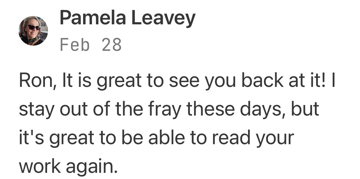 If you agree with Pamela Leavey , please click the orange button to subscribe to Convulsions. Choose a paid subscription, which for less than 14 cents a day gets you twice as much content including the “Morning Read-In,” from which this newsletter is adapted.
